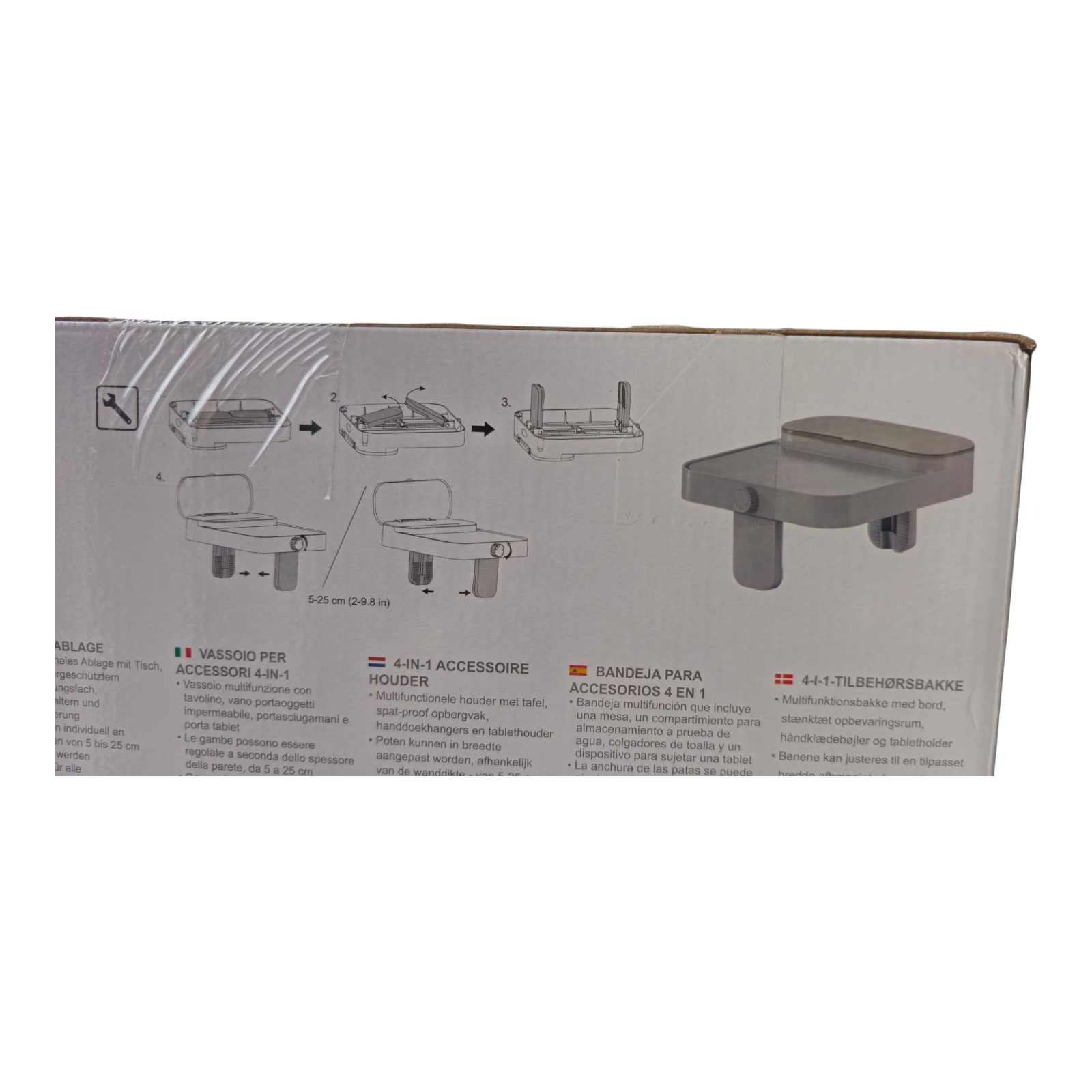 • Multifunctional design with tray, tablet holder, splash-proof compartment and towel hangers